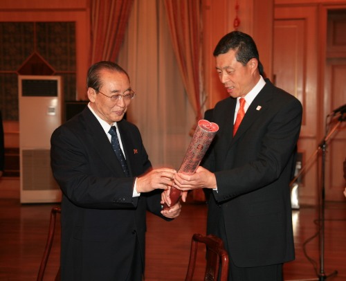 劉曉明說(shuō),在這春光明媚、鮮花盛開(kāi)的美好季節(jié),我很高興與朝鮮各界朋友和外交使團(tuán)同事們歡聚一堂,共同迎接北京奧運(yùn)圣火的到來(lái)。我謹(jǐn)代表中國(guó)大使館對(duì)楊亨燮副委員長(zhǎng)出席今晚的招待會(huì)表示衷心的感謝,對(duì)各位朝鮮同志和奧運(yùn)火炬接力途經(jīng)國(guó)家的使節(jié)們的到來(lái)表示熱烈的歡迎!