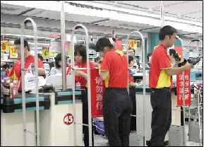 昨天上午9點半左右,在白石橋方圓店,家樂福店員們穿著紅黃兩色的新裝,胸前印著國旗,有的帽子上印著“beijing2008”字樣,有的印著五環(huán)和中國印等標識。記者隨后又來到家樂福中關(guān)村店和國展店,兩店的員工也大多身著新裝頭戴新帽。國展店一位女店員說,4月26日,店里給員工發(fā)了新的員工裝,據(jù)說成本是帽子80元、上裝近200元。