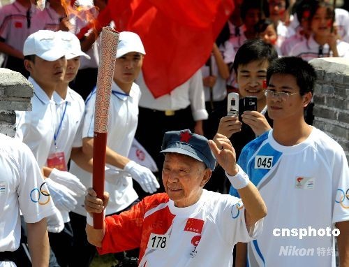 5月14日,95歲高齡的劉家奇老人在中華蘇維埃共和國中央政府舊址的“紅井”傳遞奧運圣火。 中新社發(fā) 廖攀 攝