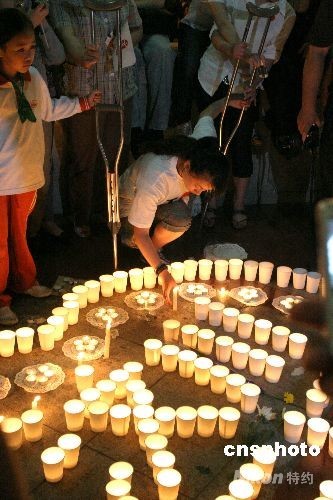 2008年5月21日,全國哀悼日的第三天,上海市政府對面的人民廣場上擠滿了對汶川地震遇難同胞哀悼的人群。在人群中有一位拄著拐杖的女孩,她便是奧運火炬手金晶,在周圍人群的攙扶下,她艱難的彎下腰點燃蠟燭并向汶川地震遇難同胞默哀。 中新社發(fā) 俊影 攝