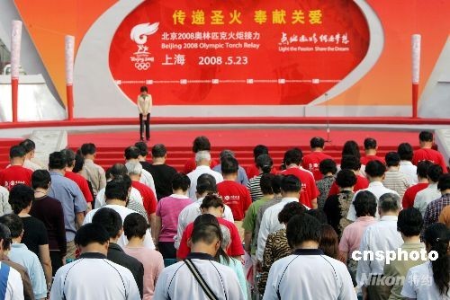 5月23日,北京奧運(yùn)圣火在上海開(kāi)始傳遞。在火炬?zhèn)鬟f起跑儀式上,所有在場(chǎng)人員默哀一分鐘,向四川地震遇難者致哀。 中新社發(fā) 湯彥俊 攝
