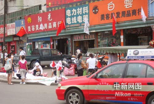 運城街頭各家商戶門面都懸掛奧運彩旗。作者 長年