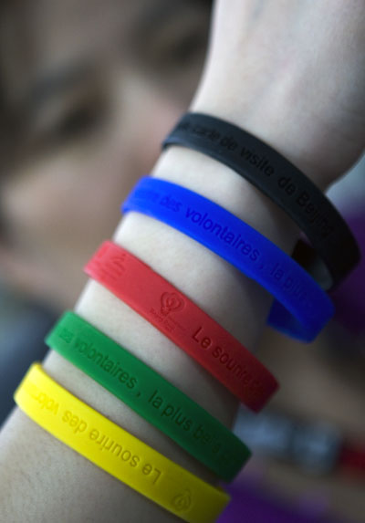 在今天上午的北京奧運會、殘奧會京外、境外賽會志愿者工作會議上,“微笑圈”法文國際版被發(fā)布,它由奧運五環(huán)顏色組成,外側(cè)印有法文“Le sourire des volontaires,la plus belle carte de visite de Beijing”,據(jù)悉,該文字翻譯稱中文就是“志愿者的微笑是北京最好的名片”的,內(nèi)側(cè)印有唯一的編號。