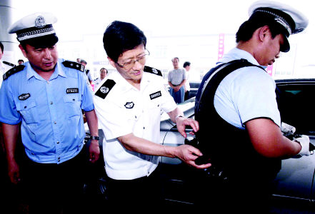 孟建柱在檢查民警單警裝備情況。趙飛攝