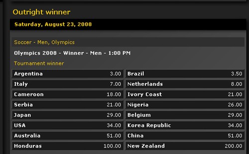 以東道主入圍的中國(guó)男足女足被足協(xié)均寄予厚望,特別是在國(guó)足無緣2010年世界杯的大環(huán)境下,足協(xié)領(lǐng)導(dǎo)希望能在奧運(yùn)會(huì)上為中國(guó)足球成功“正名”。不過BWIN的賠率還是非常冷靜,中國(guó)國(guó)奧隊(duì)奪冠賠率高達(dá)51倍,僅排在新西蘭和洪都拉斯之前,和澳大利亞并列倒數(shù)第三。