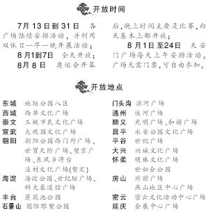 據(jù)了解,26個(gè)奧運(yùn)文化廣場包括地壇公園、西單文化廣場等,覆蓋18個(gè)區(qū)縣。內(nèi)容包括大屏幕轉(zhuǎn)播、文藝演出、文化展示、展覽等7個(gè)奧運(yùn)元素。7月13日到31日,各廣場陸續(xù)安排活動;8月1到7日,全天開放;8月8日奧運(yùn)會開幕后,晚上時(shí)間主要是比賽,白天基本上都開放;從8月1日至24日,天安門廣場每天上午安排活動。文化廣場無需任何門票,市民自由參加。