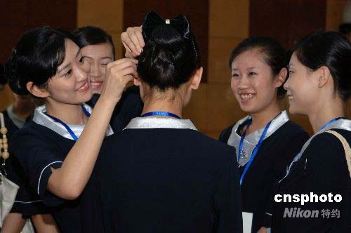 參加北京奧運(yùn)會(huì)頒獎(jiǎng)儀式的專業(yè)志愿者正在互相整理發(fā)型。中新社發(fā) 王東明 攝