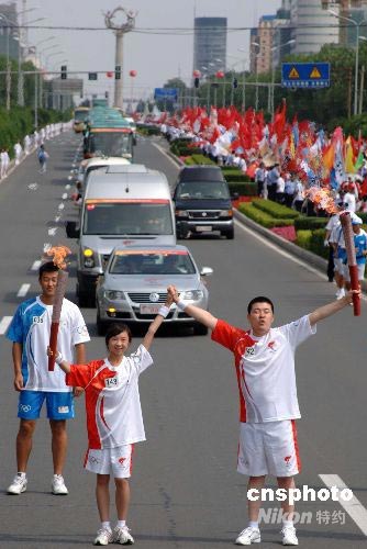 7月14日,奧運(yùn)火炬在吉林長春傳遞。圖為火炬手東北師大附小學(xué)生袁萌(左)和火炬手王洪巖交接火炬。 中新社發(fā) 廖攀 攝