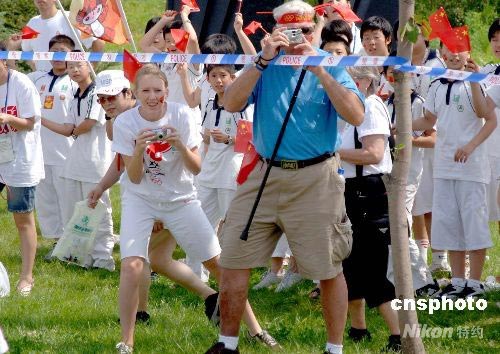 圖:外國友人熱情觀看奧運火炬?zhèn)鬟f