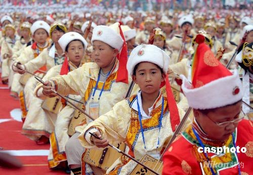 7月15日,奧運(yùn)火炬在吉林松原傳遞。松原群眾同時奏響2008把馬頭琴迎接奧運(yùn)圣火。中新社發(fā) 廖攀 攝
