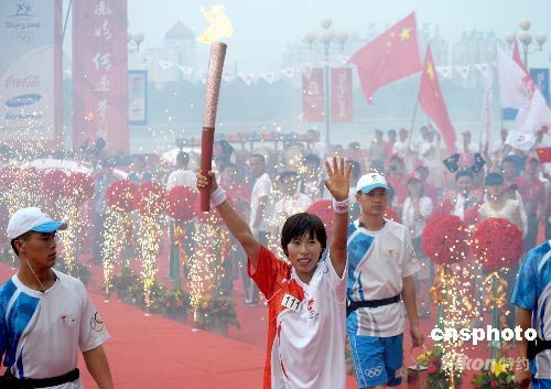 7月15日下午,奧運(yùn)火炬在吉林省吉林市進(jìn)行傳遞,越野滑雪運(yùn)動(dòng)員王春麗在熱烈的煙火歡慶中跑出火炬?zhèn)鬟f第一棒。 中新社發(fā) 廖攀 攝
