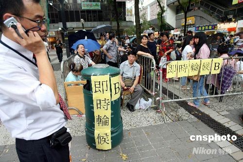 中銀香港發(fā)行奧運紀念鈔掀起全城狂熱。連日來數千計市民冒“黃色暴雨”排隊輪候,發(fā)售奧運紀念鈔票的各分行滿是擁擠的人龍。七月十五日下午,中銀香港尖沙咀分行向通宵排隊的市民作登記。 中新社發(fā) 洪少葵 攝