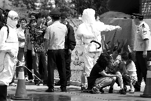 昨天上午,在臨時搭建的電影院里,工作人員模擬恐怖分子,使用一種白色粉末狀不明物質(zhì)實施了生物恐怖襲擊。北京市反恐辦接到報警,立即通知衛(wèi)生局,全市衛(wèi)生系統(tǒng)實時啟動處置生物恐怖襲擊事件應急預案。疾控、急救、傳染病醫(yī)院等數(shù)支24小時待命的生物反恐應急小分隊接到任務命令。兩分鐘后,隊員攜帶應急處置物資火速趕赴現(xiàn)場,同時,衛(wèi)生局、疾控中心和衛(wèi)生監(jiān)督所負責人分頭趕到現(xiàn)場指揮。
