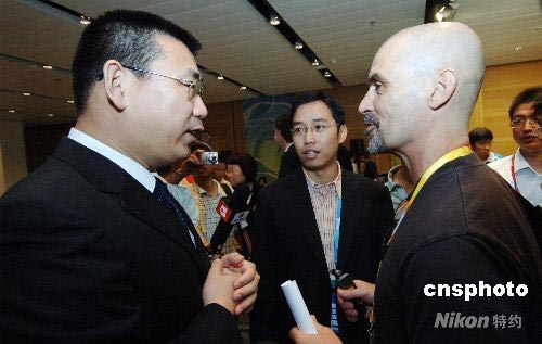 7月16日,北京奧組委志愿者部部長劉劍(左)邀請美聯社記者斯蒂芬來北京作奧運志愿者,并邀請他喝北京的豆汁。當日,北京奧組委志愿者部相關官員在北京奧運主新聞中心向中外記者介紹奧運志愿者籌備的相關情況。中新社發(fā) 王東明 攝