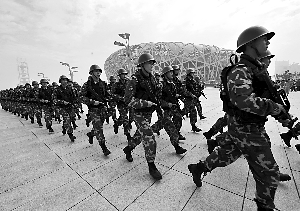 “服從命令、聽從指揮、忠于職守、英勇善戰(zhàn)……”昨日上午9時(shí),鳥巢與水立方之間的廣場(chǎng)上,武警北京總隊(duì)某部1500名官兵代表緊攥右拳,向國(guó)旗和國(guó)際奧委會(huì)會(huì)旗宣誓。奧運(yùn)期間,這支武警部隊(duì)將負(fù)責(zé)奧運(yùn)最核心區(qū)域、賽事的警衛(wèi)及處突反恐工作,是北京賽區(qū)任務(wù)最重、用兵量最大、投入安保時(shí)間最長(zhǎng)的部隊(duì)。