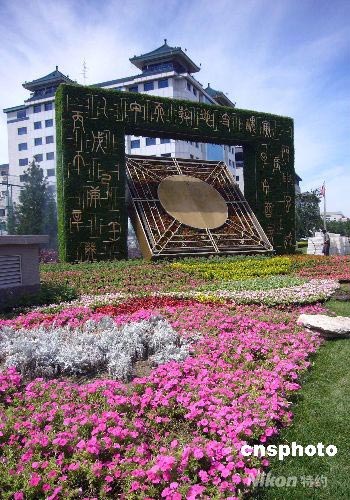 7月17日,北京東單路口,極具中國傳統(tǒng)特色的立體花壇,日晷、司南、渾天儀造型的奧運花壇已初露風(fēng)采,有關(guān)人員正在加緊擺放工作。 中新社發(fā) 玉龍 攝