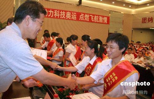 7月18日,承擔(dān)北京奧運(yùn)火炬研制任務(wù)的中國航天科工集團(tuán)第三研究院在北京舉行總結(jié)和頒獎(jiǎng)大會(huì),對(duì)該院奧運(yùn)火炬研制及技術(shù)保障團(tuán)隊(duì)進(jìn)行表彰。據(jù)悉,在借鑒火箭發(fā)動(dòng)機(jī)技術(shù)的基礎(chǔ)上,北京奧運(yùn)火炬燃燒系統(tǒng)大膽創(chuàng)新,各項(xiàng)指標(biāo)都遠(yuǎn)遠(yuǎn)超出北京奧組委設(shè)計(jì)要求,多項(xiàng)技術(shù)世界首創(chuàng),并已經(jīng)申請十幾項(xiàng)專利。 中新社發(fā) 孫自法 攝