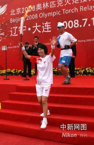7月19日,北京奧運火炬在大連傳遞,被譽為“東方神鹿”的奧運會長跑冠軍王軍霞起跑第一棒火炬。記者周兆軍攝
