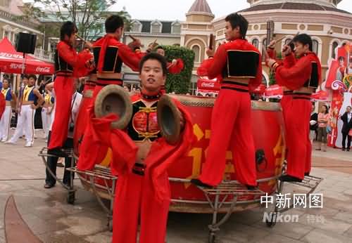 7月19日,北京奧運火炬在大連傳遞,當?shù)孛癖娗庙懲L鑼鼓激情迎接奧運火炬。記者周兆軍攝