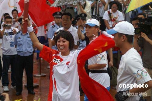 7月19日上午8時(shí),北京奧運(yùn)火炬在大連傳遞,傳遞路線從大連經(jīng)濟(jì)技術(shù)開發(fā)區(qū)發(fā)現(xiàn)王國主題公園開始,到經(jīng)濟(jì)技術(shù)開發(fā)區(qū)中華武館結(jié)束,全長(zhǎng)9.41公里。大連市共有火炬手208名,圖為中國第一個(gè)歐文斯獎(jiǎng)獲得者、奧運(yùn)冠軍王軍霞傳遞第一棒火炬。 中新社發(fā) 宋太盛 攝