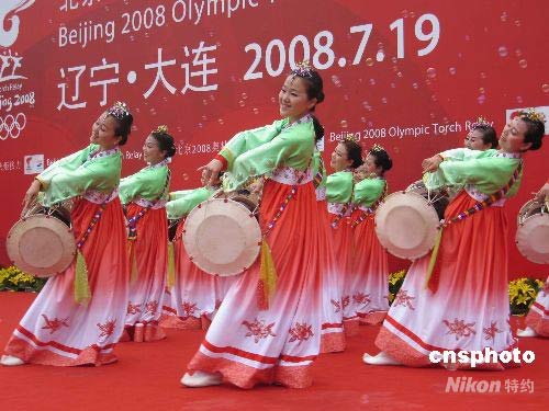圖為大連民眾跳起民族舞蹈激情迎北京奧運(yùn)火炬?zhèn)鬟f。 中新社發(fā) 沈殿成 攝