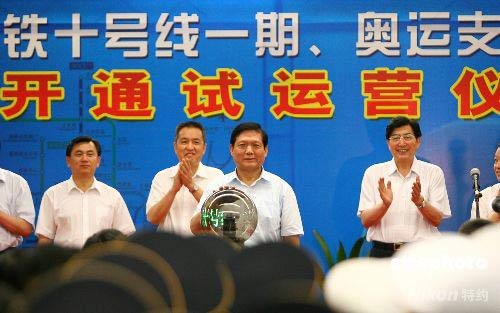 7月19日,北京地鐵10號線(一期)、奧運支線、機場線開通試運營儀式在地鐵10號線與奧運支線交匯的北土城站舉行。中共中央政治局委員、北京市委書記、北京奧組委主席劉淇啟動三條地鐵線路。 中新社發(fā) 富田 攝