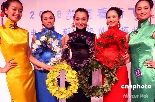 7月20日,2008美麗看新飛--新絲路世界模特大賽中國區(qū)總決賽在遼寧大連啤酒節(jié)上舉行,是次賽事經過在中國5大城市巡演后的最后一站。15名中國賽區(qū)職業(yè)選手參加了5大城市巡演選拔,最后角逐出了10名最佳模特參加10月在北京舉行的新絲路世界模特大賽國際總決賽。圖為參賽模特選手身穿五色旗袍展示五環(huán)奧運風采。 中新社發(fā) 錢興強 攝