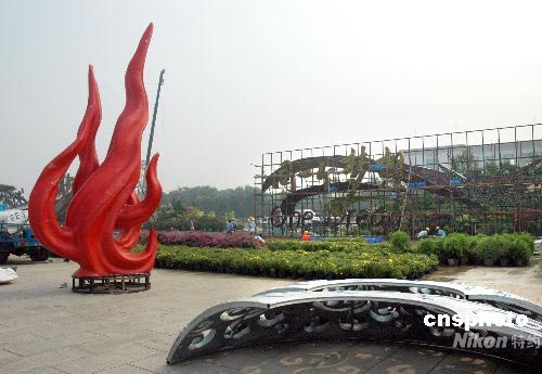 7月23日上午,天安門廣場(chǎng)一個(gè)火炬造型的裝飾景觀,紅色造型的火炬引人矚目。天安門廣場(chǎng)迎奧運(yùn)盛會(huì)為主題的大型花壇即將完工。中新社發(fā) 張雙雙 攝