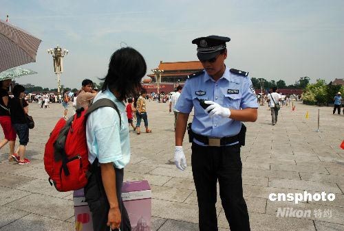 近日,奧運(yùn)臨近,天安門廣場民警對(duì)游客攜帶物品檢查越來越嚴(yán)格。圖為巡邏的民警正在盤查游客包裹,以保障奧運(yùn)會(huì)順利進(jìn)行。中新社發(fā) 張雙雙 攝