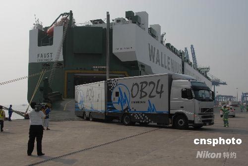 7月24日,瑞典籍大型滾裝船舶“弗斯特”號裝載的58輛高清電視轉(zhuǎn)播車在天津港滾裝碼頭接卸上岸。這批世界上最為先進(jìn)的電視轉(zhuǎn)播車來自英國、法國、比利時等6個國家,它們將全部被用于北京奧運會的電視轉(zhuǎn)播。 中新社發(fā) 胡志強 攝