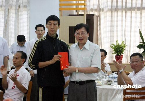 7月23日,臺(tái)灣行政部門(mén)負(fù)責(zé)人劉兆玄在高雄左營(yíng)體育訓(xùn)練中心看望備戰(zhàn)北京奧運(yùn)的臺(tái)灣體育健兒。他期許運(yùn)動(dòng)員們?nèi)σ愿,取得好成?jī)。圖為劉兆玄在該中心運(yùn)動(dòng)員餐廳,向運(yùn)動(dòng)員們致贈(zèng)加菜金,由上屆奧運(yùn)跆拳道冠軍朱木炎代表接受。 中新社發(fā) 黃少華 攝