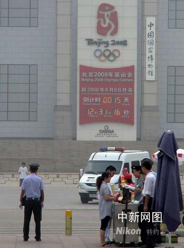 天安門(mén)廣場(chǎng)東部的奧運(yùn)會(huì)倒計(jì)時(shí)牌前保安依然嚴(yán)謹(jǐn)。作者:賈國(guó)榮