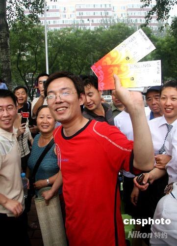 7月25日,北京奧運(yùn)會(huì)籃球比賽門(mén)票開(kāi)始在五棵松籃球館發(fā)售,北京的何先生排了60個(gè)小時(shí)的隊(duì),成為第一位購(gòu)得比賽門(mén)票的幸運(yùn)者。 中新社發(fā) 甄雪原 攝