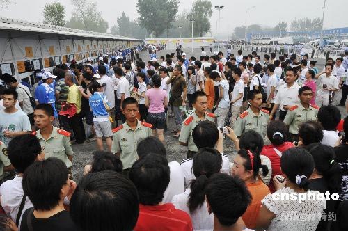 7月25日上午9點,最后82萬張北京奧運會比賽門票開始銷售。銷售現(xiàn)場異常火爆,購買門票的群眾分批進(jìn)入等候,武警官兵一字排開維持現(xiàn)場秩序。中新社發(fā) 王宇婷 攝