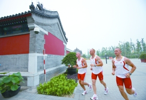 昨日,3名波蘭運動員在北京奧運村內(nèi)跑步。當天上午,北京奧運村正式開村。