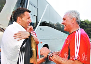 杜伊(右)熱情歡迎同胞、塞爾維亞國(guó)奧隊(duì)主帥久基奇的到來(lái)