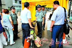 在拉上警戒線的同時,警戒線內(nèi)的人行道上同時也增設(shè)了固定的保安執(zhí)勤哨,記者看到,在短短不到20米的距離就有3名保安負(fù)責(zé)執(zhí)勤!拔沂菑谋本┼]電大學(xué)保安隊調(diào)過來的,”一名正在執(zhí)勤的保安透露,“據(jù)我所知,這里是從7月7日開始上保安的,7月15日又從北京各保安大隊調(diào)來一批保安,7月20日來北師大執(zhí)行任務(wù)的所有保安才真正調(diào)齊。”他說,除了北師大原有的保安人員外,從其他地方調(diào)來的保安就達(dá)到400多人,“我們在外面執(zhí)勤一般是3小時換一崗,每個人每天值兩班!