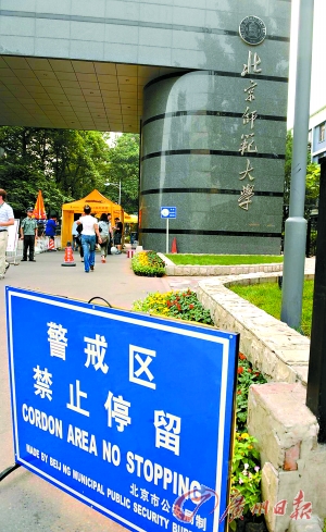記者到達(dá)北師大時正好是下班時間,學(xué)校周圍人流如織。以往門戶大開的北師大如今基本上四門緊閉,而且四周都成了警戒區(qū)。正門即南大門的電子自動門全部關(guān)閉,即便如此,還有幾名保安在附近巡邏。而學(xué)校東面從北師大國際交流中心一直到北師大東門以北都被拉上了警戒線,并且豎了公安局專門制作的警戒牌,藍(lán)底白字清楚地寫明,這里是警戒區(qū),車輛不得?。北師大東門的道路是北二環(huán)與北三環(huán)的連接線,輔路靠近北師大一側(cè)以往是畫有白色標(biāo)記線的停車位,如今白色標(biāo)記線全部擦掉,避免有粗心的司機(jī)將車?。