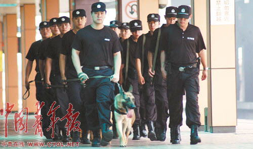 奧運(yùn)會(huì)即將舉辦,突發(fā)事件隨時(shí)可能發(fā)生。為此,上海鐵路警方調(diào)集鐵警精銳進(jìn)駐上海站,并成立了鐵路上海站奧運(yùn)安保前線指揮部。7月以來(lái),鐵路特警全副武裝攜警犬在上海站、車(chē)站廣場(chǎng)及與地方接合部晝夜進(jìn)行巡邏檢查。