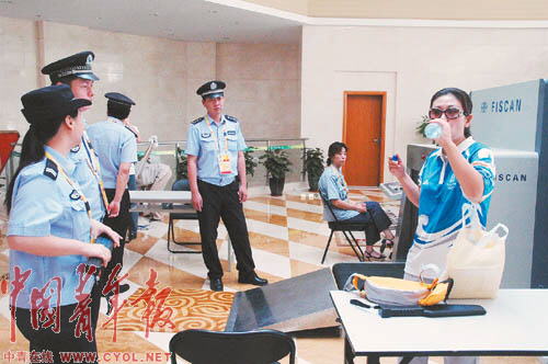 由于目前上海體育場(chǎng)實(shí)施全封閉管理,必須憑有效證件才能進(jìn)入封閉區(qū)域,記者佩戴著奧運(yùn)會(huì)注冊(cè)記者證進(jìn)入上海體育場(chǎng)。在工作人員的安檢通道:首先,要在專門(mén)的驗(yàn)證機(jī)器上檢查證件的真實(shí)性;接著,從兩根黑色柱子中間穿過(guò),而這兩根很不起眼的黑色柱子卻是非常厲害的核生化檢測(cè)儀器,任何一點(diǎn)放射性物質(zhì)都可以檢測(cè)出來(lái);隨后,就會(huì)通過(guò)和機(jī)場(chǎng)相同的安檢門(mén),如果身上攜帶了金屬物品,儀器就會(huì)發(fā)出警報(bào),工作人員就會(huì)手持安全檢查儀進(jìn)行進(jìn)一步檢查,而行李則須從X光物品檢查儀通過(guò)。而更嚴(yán)格的是,進(jìn)入奧運(yùn)場(chǎng)所的人員攜帶的手機(jī)、手提電腦都必須進(jìn)行開(kāi)機(jī)測(cè)試,攜帶的飲料則必須開(kāi)瓶試飲一口,至于打火機(jī)則不得帶入。