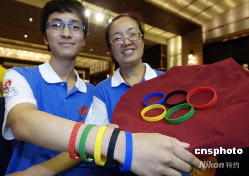 7月30日,北京奧運(yùn)會(huì)志愿者恭杰克與其母親共同展示“微笑圈”家庭版。當(dāng)日,由奧運(yùn)五環(huán)顏色組成的奧運(yùn)“微笑圈”家庭版在北京正式發(fā)布,其內(nèi)外側(cè)統(tǒng)一印有北京奧運(yùn)會(huì)、殘奧會(huì)標(biāo)志,主要面向志愿者家庭發(fā)放。中新社發(fā) 王東明 攝