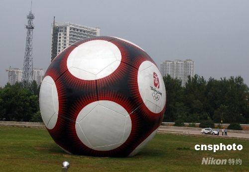 7月30日,秦皇島市區(qū)內(nèi)巨大的足球雕塑。當(dāng)日,奧運火炬在河北省秦皇島市進(jìn)行傳遞。秦皇島是北京奧運會足球比賽分賽場之一。 中新社發(fā) 廖攀 攝