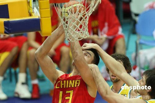 7月30日,國(guó)際籃聯(lián)2008鉆石杯男籃比賽第二輪繼續(xù)在江蘇南京進(jìn)行,中國(guó)男籃狀態(tài)萎靡,以55比67不敵澳大利亞隊(duì)。姚明本場(chǎng)得14分,但他在進(jìn)攻中卻遭對(duì)手“按頭鎖喉”。中新社發(fā) 盛佳鵬 攝