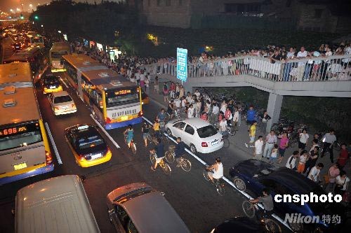 7月30日晚,北京奧運(yùn)開幕式帶妝彩排,前來(lái)“鳥巢”觀看的外圍民眾陡增,位于“鳥巢”周邊的北四環(huán)車流人流增大。 中新社發(fā) 陳文 攝