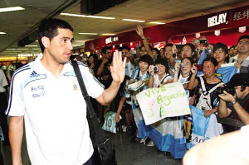 12時(shí)15分,阿根廷足球隊(duì)稍事休息后,魚貫步出候機(jī)大廳,早已等候在此的上海球迷立即歡呼起來(lái),他們有的舉著寫有運(yùn)動(dòng)員名字的牌子,有的高喊運(yùn)動(dòng)員的名字。里克爾梅等球星,也熱情地向球迷們揮手致意。