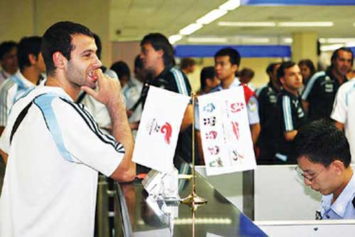 飛機(jī)比預(yù)定的時(shí)間晚到了幾分鐘,11時(shí)45分,阿根廷國(guó)奧隊(duì)的運(yùn)動(dòng)員走出機(jī)艙,他們談笑風(fēng)生,顯得非常輕松。通過(guò)檢測(cè)體溫區(qū)域后,馬斯切拉諾第一個(gè)站到了邊檢驗(yàn)證臺(tái)前!澳!”邊檢民警用西班牙語(yǔ)向這位著名球員表示問(wèn)候,并很快幫他辦理了入境通關(guān)手續(xù)。