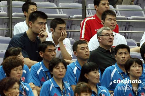 7月31日,國(guó)際籃聯(lián)2008鉆石杯男籃比賽繼續(xù)在江蘇南京進(jìn)行,與中國(guó)男籃同分在一個(gè)小組的安哥拉男籃和澳大利亞隊(duì)展開(kāi)對(duì)決。中國(guó)隊(duì)主教練尤納斯率姚明等球員在觀眾席上觀看比賽。中新社發(fā) 盛佳鵬 攝