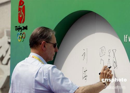 8月1日,北京奧運(yùn)村“和平友誼墻”正式啟動(dòng)。國際奧委會(huì)主席羅格在和平友誼墻“簽名墻”上簽下自己的中文名字。 中新社發(fā) 杜洋 攝