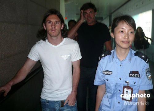 八月一日,阿根廷足球明星梅西(左),搭乘法航一一六次航班飛抵上海,在安保人員陪同下走出候機(jī)樓,與先期抵達(dá)的阿根廷國(guó)奧隊(duì)匯合,備戰(zhàn)將于八月七日開(kāi)始的北京奧運(yùn)會(huì)足球上海賽區(qū)比賽。 中新社發(fā) 劉友平 攝