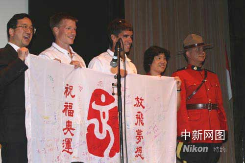 精彩的演出中,兩位陽(yáng)光小伙——加拿大皮劃艇國(guó)家隊(duì)隊(duì)員,奧運(yùn)選手希爾和莫蒂默的到來(lái)讓觀(guān)眾格外興奮。而對(duì)于主持人黃源博士精心準(zhǔn)備的加試——“筷子夾乒乓球”,他們輕松過(guò)關(guān),獲得了在場(chǎng)所有人簽名祝福的奧運(yùn)五環(huán)旗這一特別禮物。他們也表示將會(huì)帶著大家的祝愿,盡最大努力實(shí)現(xiàn)目標(biāo)。